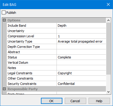 Each product format has a different set of options. The options for the S‑102 format are: • Options: • Uncertainty Band: The band in the source data that contains uncertainty values to be included in the resulting products. • Abstract: A textual description of the output product, as per ISO 19115. • Depth Correction Type: Select the type of corrections to apply to depth values in the resulting products. • S-100 Vertical Datum: The vertical datum of the raster source data. • Uncertainty Type: The type of uncertainty data stored in the input band to be included in the S-102 metadata. • Responsible Party: Descriptive identifying information for the responsible party for the data - name, position, organization and role of the user. 1. Click the browse button (...) to launch the Edit S-102 dialog box. 2. Click the Publish check box at the top of the dialog box to have products created in this format. 3. Define any necessary settings. 4. Click OK. |