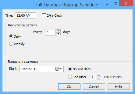 This dialog box is used to define when the backup will be performed, for example, every Friday at 6:00 pm.