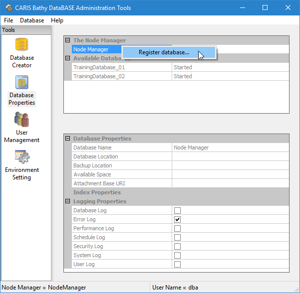 All databases must be registered in the Node Manager in order to be started in Administration Tools and accessed from BASE Editor. This is done automatically when a new database is created. In addition to new databases, you can also register an existing database, for example, a database created from an older version of the software that is not registered with the current Node Manager.