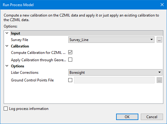 The Compute/Apply CZMIL Calibration process model can be used to compute calibration on CZMIL data and then apply it using the Georeference CZMIL Points process. This calibration is used to apply corrections to the data to compensate for misalignments of sensors and flightlines during data acquisition.