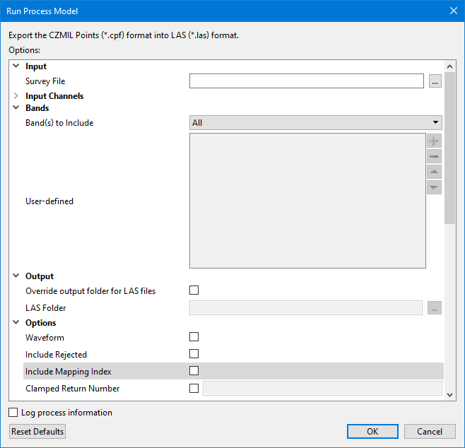 Include Mapping Index | Enable this option to export a unique mapping index value for each point for later use as an identifier in the Update CZMIL from LAS process. See Update CZMIL from LAS for information on this process. |