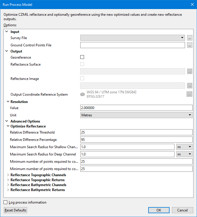 Note: The Optimize CZMIL Reflectance process itself does not georeference the data or generate outputs, the process model must be used to achieve those outcomes. |