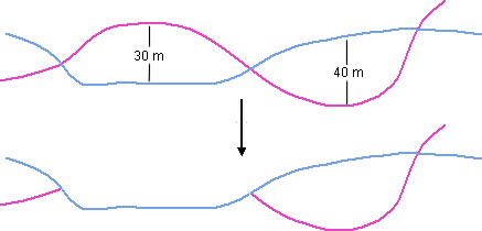 This example uses two lines. The fixed line is shown in blue. The distance between the fixed line and the unselected line is 30 metres at one point and 40 metres at the other.