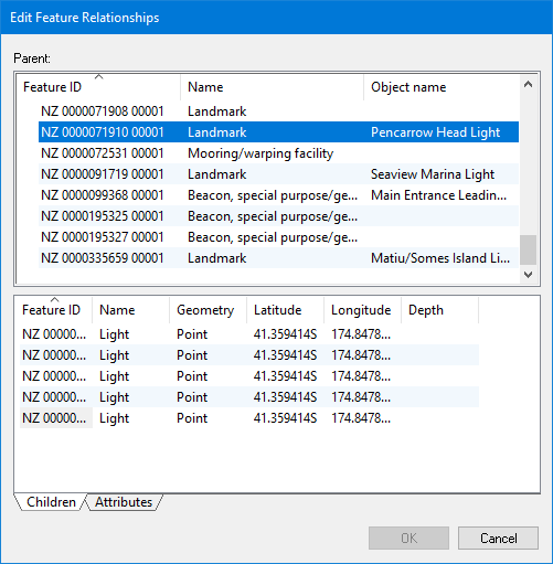 A parent/child relationship is a hierarchical relationship between features at the same location. One feature is designated the parent, others are its children. For example, a buoy could be a parent and attached equipment such as lights and navigational devices would be its children.