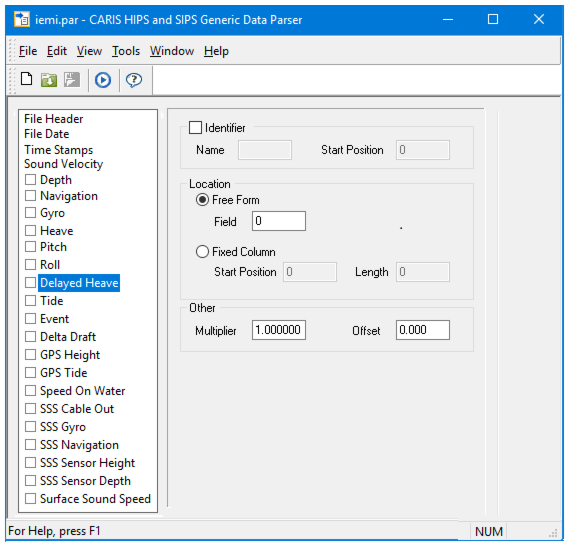 The Generic Data Parser launches in its own interface and is used to convert data such as roll, tide, heave etc., from ASCII files into HIPS format.