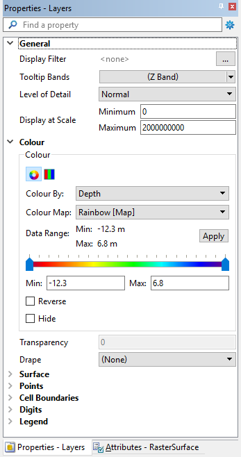 When you select a layer in the Layers window, its properties are displayed in the Properties window. Although all properties are displayed, only those relevant to the 3D View will be enabled. Adjusting these properties changes the 3D view.