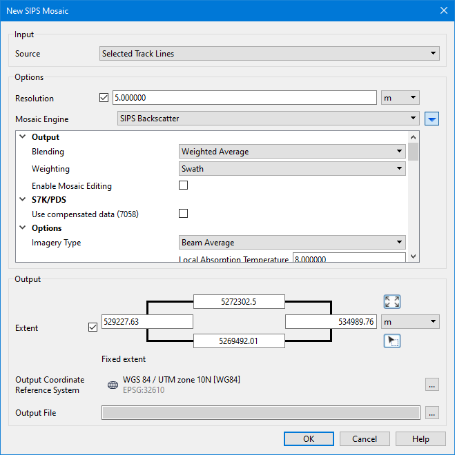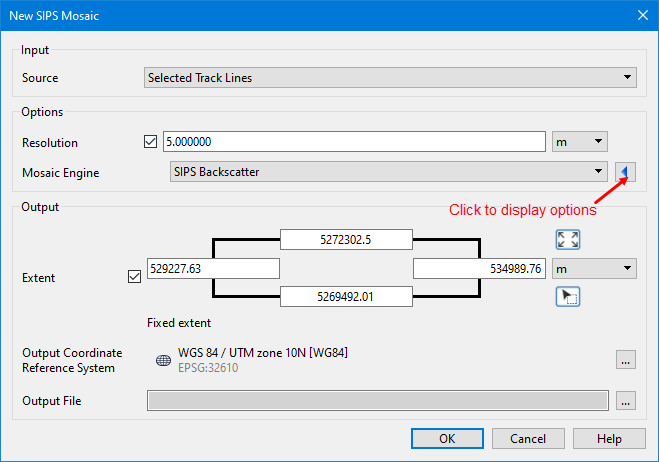 Source | The input source for the mosaic. The options available include: • Selected Track Lines: This setting will create the new mosaic using only track lines that are currently selected. This setting is selected by default if lines were selected before opening the dialog box. • <HIPS track lines layer>: This setting will create the file using all track lines in the selected layer. All layers containing track lines shown in the Layers window are included in the list as available sources, including filter layers. • All Track Lines: This setting will create the new mosaic using all track lines from all datasets currently open in the application. This setting is selected by default if no lines were selected when the dialog box was opened. | |