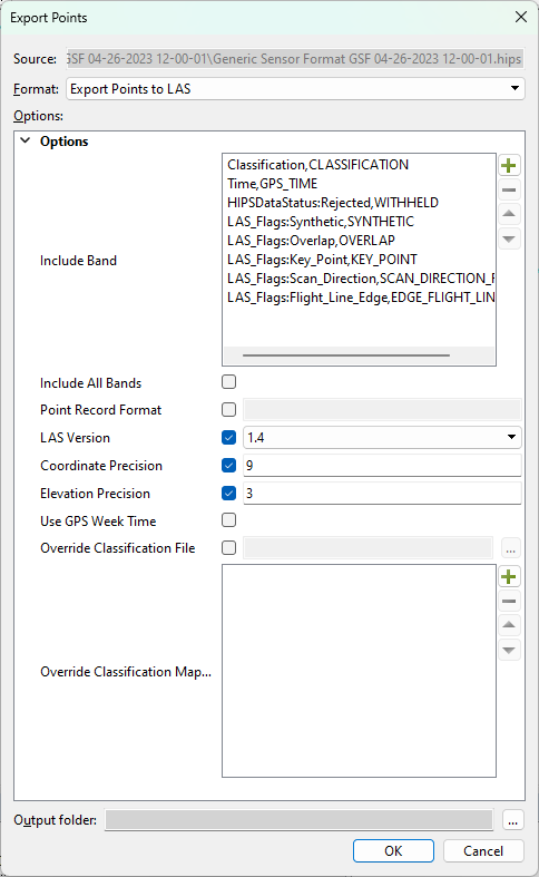 The Include Band option can be used to map the attribute bands of the coverage to relevant attributes in the LAS output file. If this option is not used, only the Depth and Status bands will be exported to the LAS file.