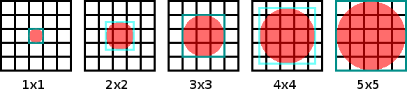 The figure below shows the sizes of various maximum footprints as they would appear on the pixel grid. The sounding will only be applied to pixels that are within the red circle.