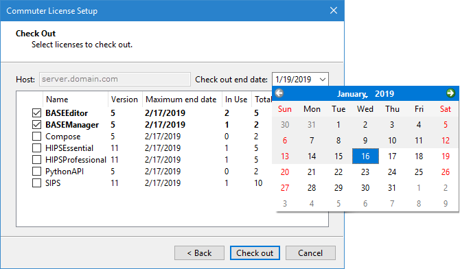 The Check Out step is displayed. This step is used to select the modules licenses you want to check out and the end date for the commuter license.