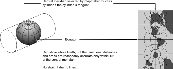 Mathematically projected onto a cylinder tangent to a meridian. The cylinder may also be secant