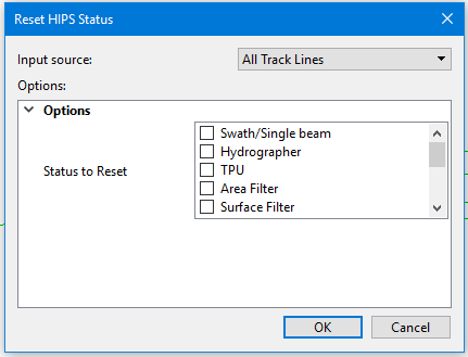 Input Source | From the drop down list, select the input data to be reset. Select either: • All Track Lines - reset will apply to all open track lines. This is the default setting. • Selected Track Lines - reset will apply to those track lines individually selected before opening the Reset HIPS Status dialog box. • A specific named track lines layer from either the Layers or Active Track Lines window. | |