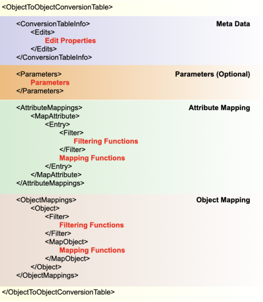 The <ObjectToObjectConversionTable> tag is the root tag for all other elements in the file.