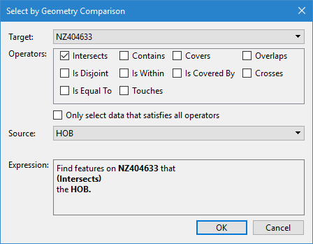 The required relationship between the source geometries and the target features. Selecting multiple operators will result in the selection of features that meet any or all of the selected operators, depending on whether the Only select data that satisfies all operators option is enabled.