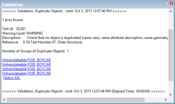 Each feature that fails a test is listed in the Validation window and hyperlinked.