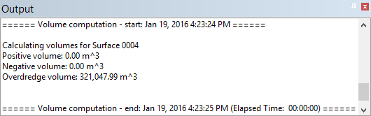 A progress bar will be displayed to track the progress of the calculation. As each selected surface is calculated, the results will be displayed in the Output window as raw data, meaning values have not been rounded or converted to the unit of measure being used in the application. If volume cannot be calculated for any reason, the name of the problematic surface will be output with an error message as the last entry in the Output window and the operation will stop.