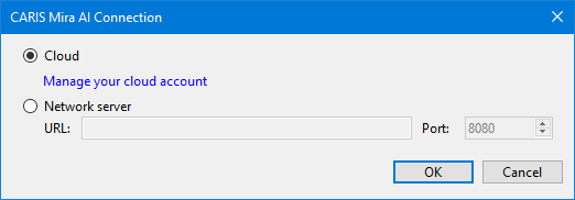 The default setting for the connection is Cloud. The Manage your cloud account link can be used to create and/or manage a cloud account. The credentials for this account will be used to access CARIS Mira AI when running a process.