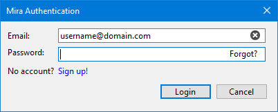 Note: By default, the login credentials for the service are remembered on the current computer once they have been entered. This eliminates the need to re‑enter your credentials the next time you start the application and connect to the service. These credentials can be changed, if needed, using the Set CARIS Mira AI Account credentials command. See Set CARIS Mira AI Account Credentials for more information.