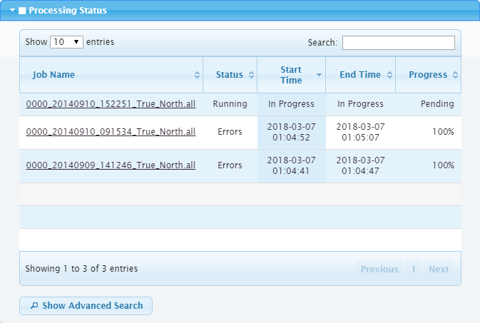 If the number of jobs being processed grows to a large number, the search functions provided in the Processing Status panel can be used to limit the list. See Searching the Job Database for information on these tools.