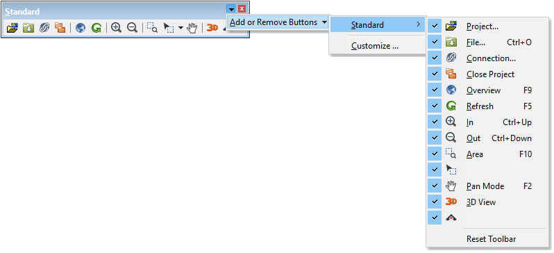 Individual tools can be displayed or hidden. You can also modify the appearance and display of toolbars and tools.