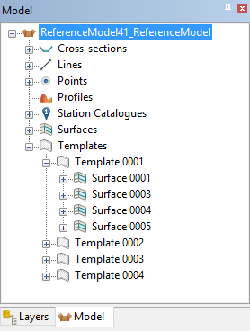 The Model window provides a tree-structure view of the current reference model. From this window, all features in the model can be viewed and selected. Reference model features can also be added to or removed from the model from this window.