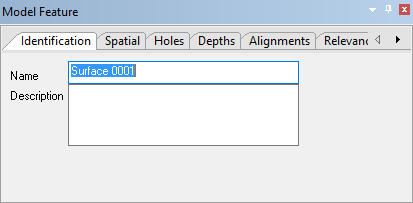 The Model Feature window is used to define the various settings of reference model features. Different tabs are provided in the window based on the type of feature selected. For example, when a reference model surface is selected, there are 6 tabs provided for defining things like the depth values of the points that make up the surface, the order of the points and any holes in the surface.