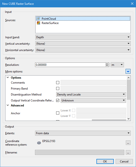 The New CUBE Raster Surface dialog box is used to define the parameters for generating a CUBE surface.