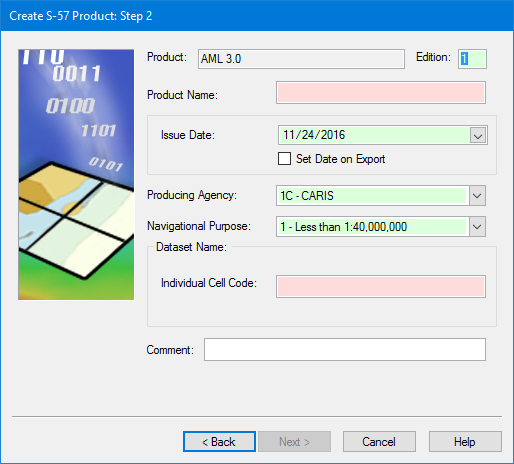 Dataset Name | [Mandatory] A name for the dataset which is built from the fields in the frame: • Individual Cell Code: A unique code for the product. For AML 3.0 products, the cell code is used as the file name. Any alphanumeric combination can be entered, but it should follow the AML 3.0 standard. This requires that the file name include a three-character country code. If necessary, you can look these codes up in |