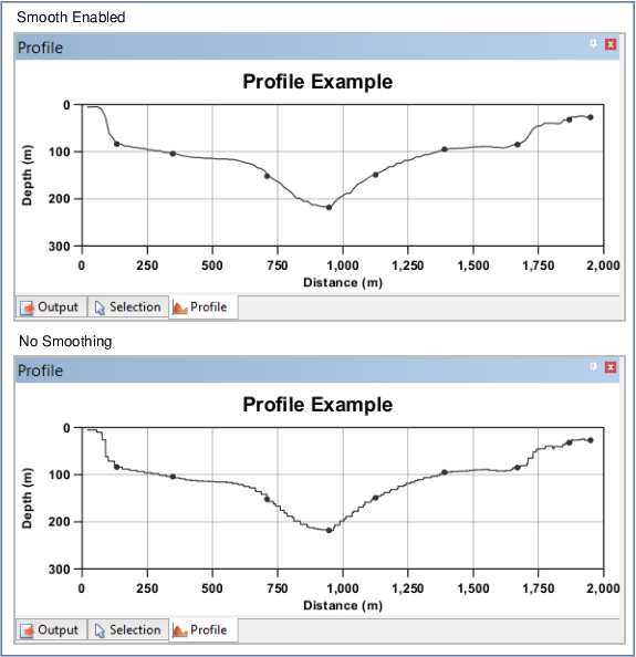 Smooth the display of the profile line in the profile graph. Smoothing is applied to reduce the number peaks in the graph if it has a high number of sample points. The number of sample points is based on the Sample step size setting. There are three types of smoothing to choose from: