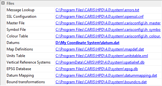 In this example, the location of the datum file has been changed from the default in the CARIS system directory to a custom file in another location.