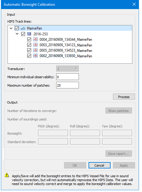 11. Click Save report to create a file containing a text version of the process results, e.g. the number of iterations needed to converge, the number of selected soundings and the boresight estimation results