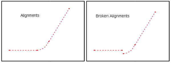 Typically, a series of alignments creates a continuous linear geometry; however, it is possible to create broken alignments, as shown in the following illustration.