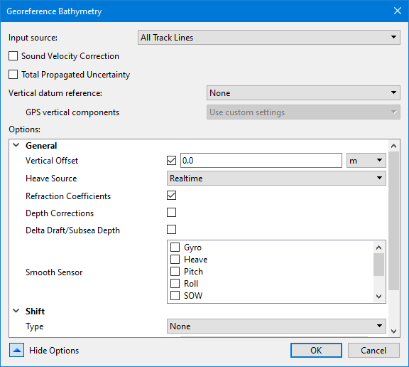 Vertical datum reference | The type of vertical datum to apply to depth values when georeferencing points. The options include: • None: No vertical adjustments are applied. • Tide: A file of observed tidal corrections is applied. • GPS: GPS height values are applied using a model file. Selecting Tide or GPS will cause additional fields to be added to the Options list, specific to each of the datum types. The default is None. |
