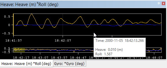 An asterisk next to the name of a data type, whether in the title bar or the window tab, identifies the active data type. In the example below, Roll is the active data in the Heave window.