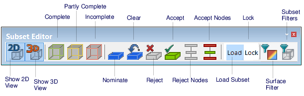 Subset Editor commands can be activated from the Subset Editor toolbar, which is automatically opened when the editor is started. (If it is not visible when Subset Editor is opened, use the View > Toolbars > Subset Editor command to open it.)