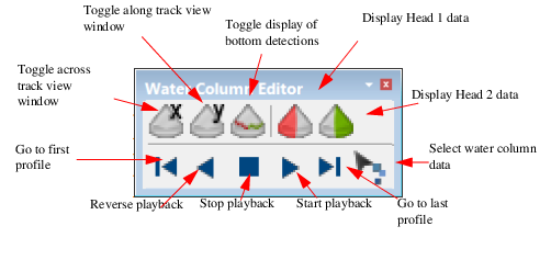 The Water Column toolbar contains the controls to open and close the Across track and Along track windows, to display the bottom detection and to control the play back of the imagery.