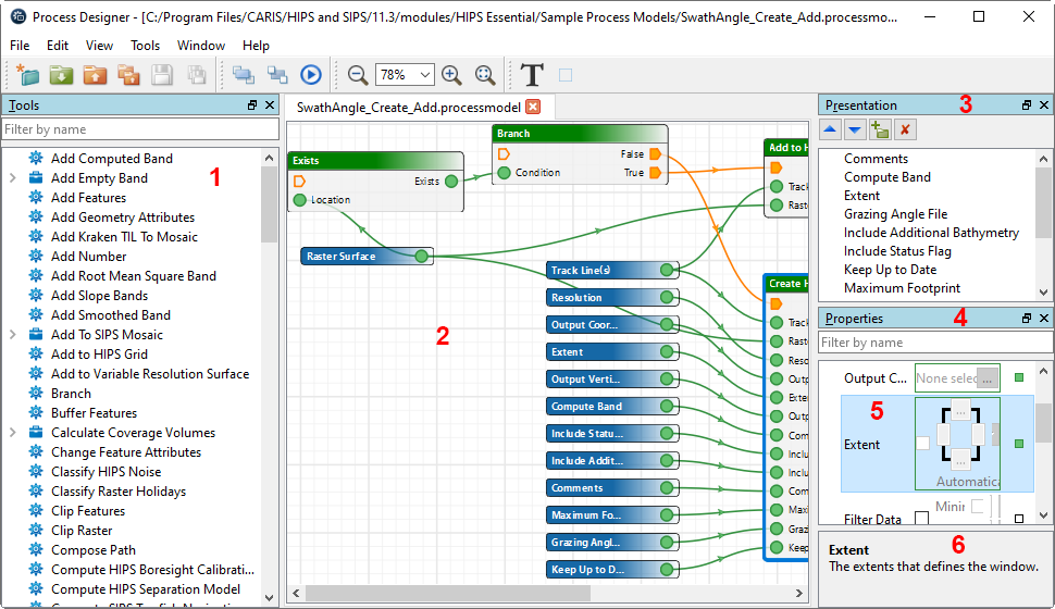 In Process Designer, process tools are listed in the Tools list (1). These tools can be added to the display window (model view) (2). The inputs can be ordered in the Presentation window (3), and the tools can be ordered, connected and have properties and options set in the Properties window (4).