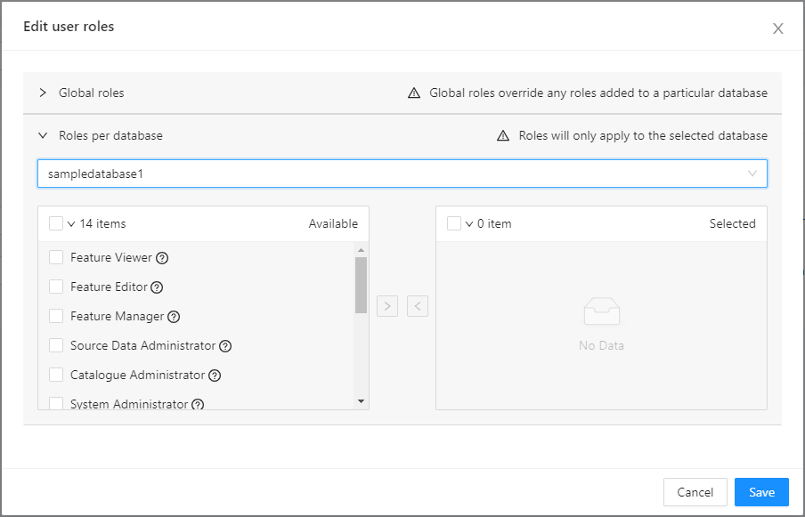 Each user account is assigned roles that determine what functions they can perform in CARIS applications, including both read-only access and editing through the BASE Manager module in BASE Editor. Roles can be assigned on a global basis or per database. Global roles provide the same level of access to all databases in the server instance. Database roles only apply to the individual databases for which the role was given. If a user has both global and database roles, the global roles will override the database roles.