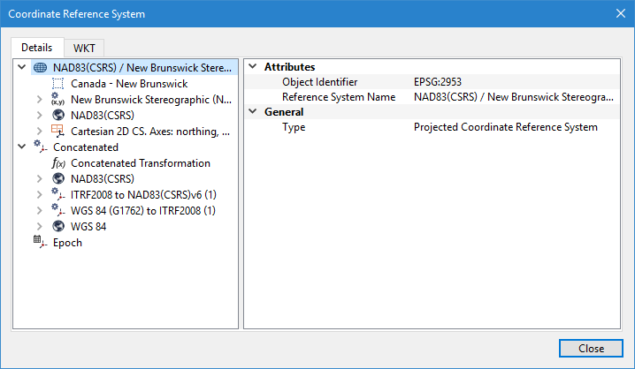 WKT | This tab displays the coordinate reference system as a WKT (Well Known Text) string. You can select and copy this string using the pop-up menu. |