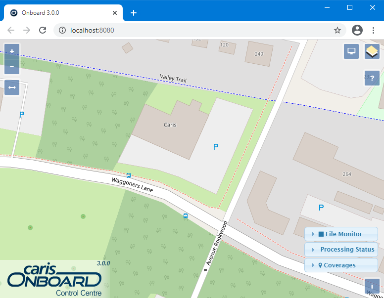 If the computer has an internet connection, there will be an automatic connection to OpenStreetMaps®, centred on the current location of the computer. If no internet connection is available, it will display the Onboard controls with either a blank screen or the base map that is available for download from the Teledyne CARIS Customer Services website. In order for survey data to be included in the display, the Control Centre must be configured. Refer to the Control Centre help for information on how to configure the application.
