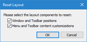 Restore the windows and toolbars to the factory default sizes and positions for the currently enabled modules and editors.