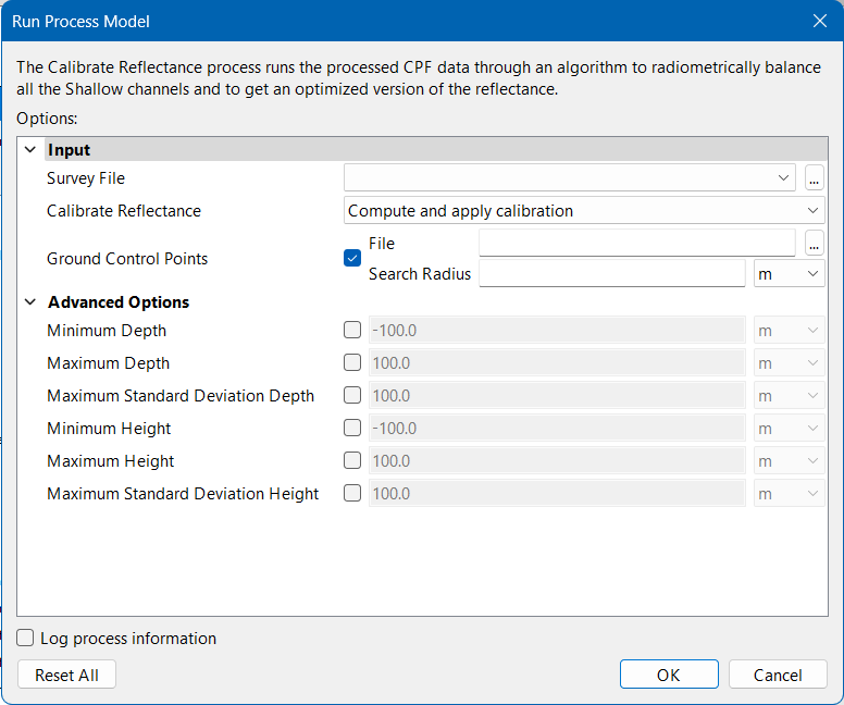 The Calibrate Reflectance process model runs the processed CZMIL data through an algorithm to radiometrically balance all the Shallow channels and calibrate the reflectance values to be applied to the CPF files. .