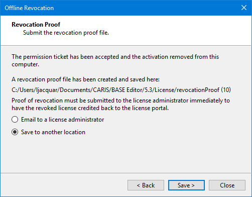 The Revocation Proof step generates a revocation proof file. This file must be sent to the license administrator to complete the revocation process and credit the activation back to the license portal.