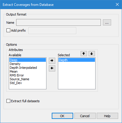 Attributes | Select the attributes to include in the extracted coverages. The Available list includes all attributes present in the coverages associated with the database objects in the defined area. The Selected list includes all attributes that will be included in the extraction. The primary Z attribute is selected by default and cannot be removed. 1. Select an attribute in the Available list. 2. Click the Right-Arrow button to move the attribute to the Selected list. 3. Use the Up- and Down-Arrow buttons to change the order of the attributes in the list, if needed. Attributes can be removed from the Selected list if needed using the Left-Arrow button. |
