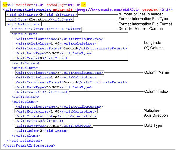 Column Index | This property is used to assign a column index number to the selected attribute column in the source file. Using the column number specified in the format information file, an import tool assigns the values in the column to the appropriate attribute for each line. This property is only available for delimited format information files. | |