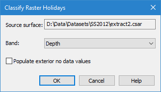 The classification information is added to the surface as a new band. All holiday bands are named according to the band that was classified and appended with the word “Holidays”. For example, if the Depth band of a surface were selected, the resulting band would be called “Depth and Holidays”. This band can be removed from the surface, if needed, using the Remove Band command. See Delete Band for more information.