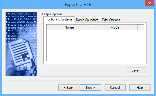 The second step of the Export Coverage to HTF wizard is used to enter details for the Positioning Systems, Depth Sounders and Tidal Stations of the data to be exported.