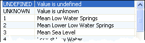 Enumerated attributes where the values can be ranked in order. Examples are the NATSUR and NATQUA attributes. Attribute values can be on an equal level or in a hierarchy. Values on an equal level are separated by a comma. A surface that contains both mud (1) and shells (17) is shown as | 1. Select the attribute. 2. Click browse ( The Create Enumerated List of Levels dialog box is displayed.