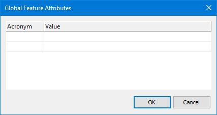 2. Select an attribute acronym from column 1. 3. Enter a value in column 2. 4. Click OK. 5. Enable Override Existing Attributes to replace values if the same attributes are used in the imported features. | |