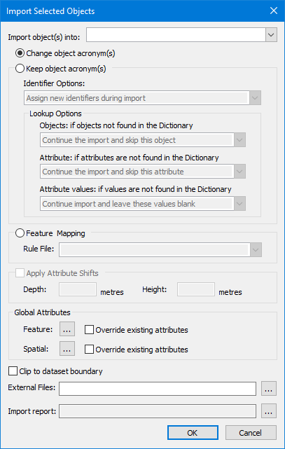 Keep object acronyms | Retain existing acronym and attribute values. • Identifier Options: Choose to assign new feature object IDs or use existing object IDs. Select from the list. • Use existing identifiers (skip object if identifier already in use). • Use existing identifiers (assign new object identifiers if identifier is already in use). • Assign new identifiers. • Lookup Options: Choose what to do if objects, attributes, or attribute values in the imported data are not found in the dictionary. Select from the list |
